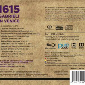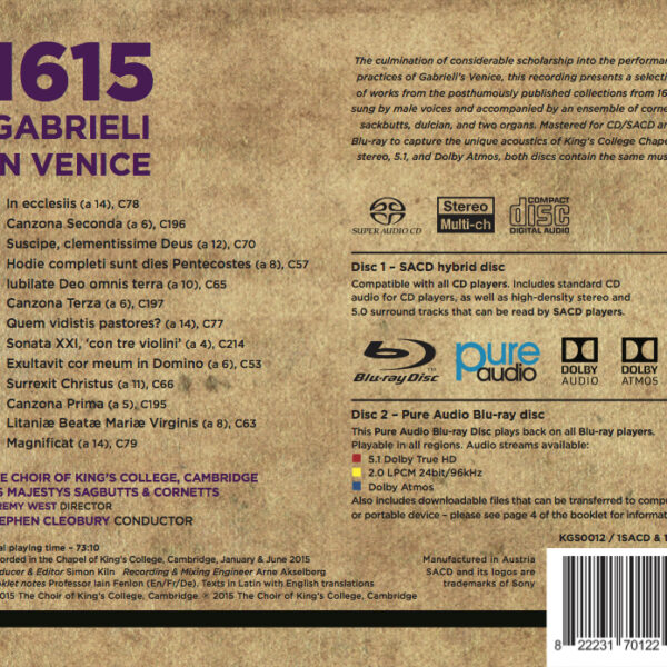 Much of Giovanni Gabrieli’s music was composed for grand ceremonial occasions. 2015 marked not just the 400th anniversary of the publication of this collection of works from 1615, but also the 500th anniversary of the completion of King’s College Chapel. The Choir celebrates these anniversaries with the first classical album ever to use Dolby’s new Atmos technology to reproduce the acoustics of the Chapel with unprecedented realism.