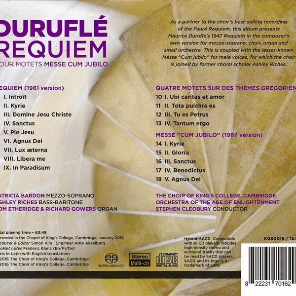 King’s College’s recording of the Fauré Requiem was the best-selling core classical album of 2014. For this new recording featuring another great French Requiem, the Choir is reunited with the Orchestra of the Age of Enlightenment to perform Maurice Duruflé’s 1947 Requiem, in the composer’s own version for soprano, choir, organ and small orchestra. The album is completed with the Messe Cum Jubilo for male voices and the Four Motets, mirroring Fauré’s Messe Basse for boys on the earlier album to which this is very much a partner.