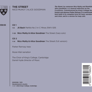 On his second album for King’s College, Cambridge, harpist and alumnus Parker Ramsay performs The Street, a dramatic new work by acclaimed composer Nico Muhly and librettist Alice Goodman for harp solo, narration and plainchant, based on the Fourteen Stations of the Cross.